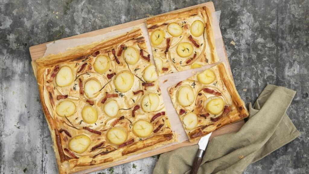 4 Smooth the sour cream evenly almost to the edges. Distribute the potatoes, then scatter on the onions, followed by the bacon and thyme over the top.