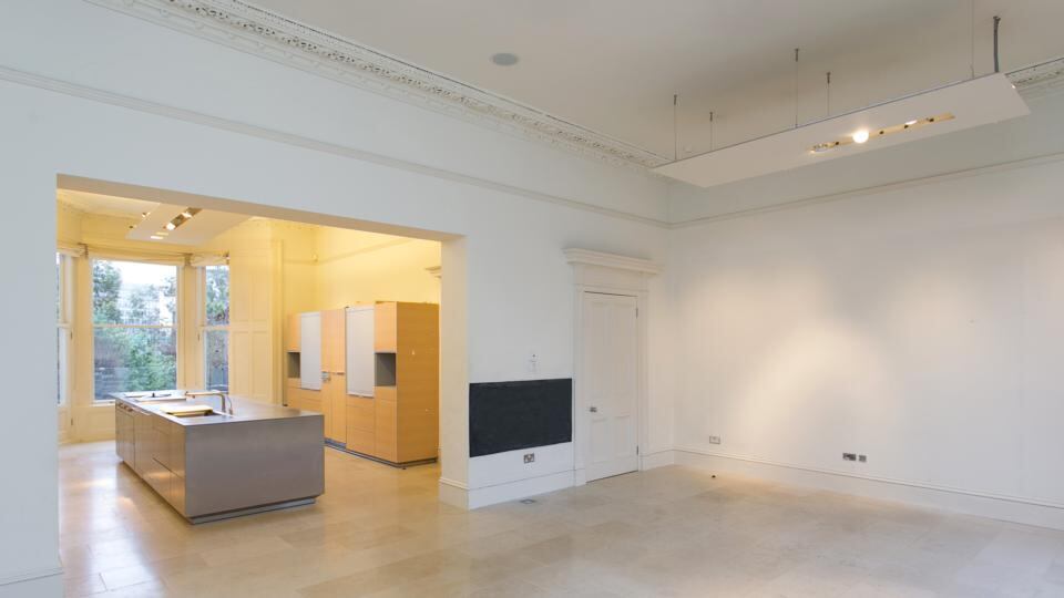 The formal drawingrooms are up on the first floor – again an open L-shaped space but with stunning decorative plaster work, pillars and a fine pair of fireplaces. The flooring here has been replaced with American oak.