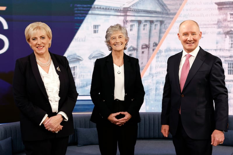 Irish presidential candidates (from left) Heather Humphreys, Catherine Connolly and Jim Gavin at RTÉ studios in Dublin last Sunday before Gavin pulled out of the race. Photograph: Conor Ó Mearáin/PA